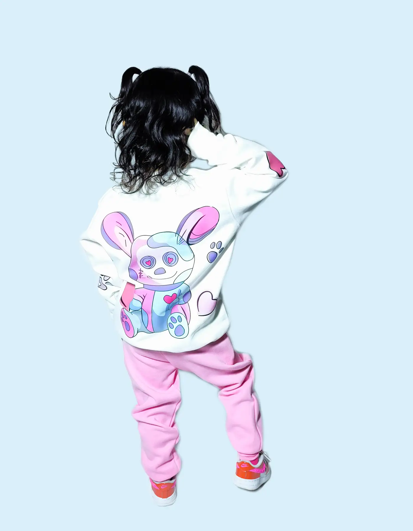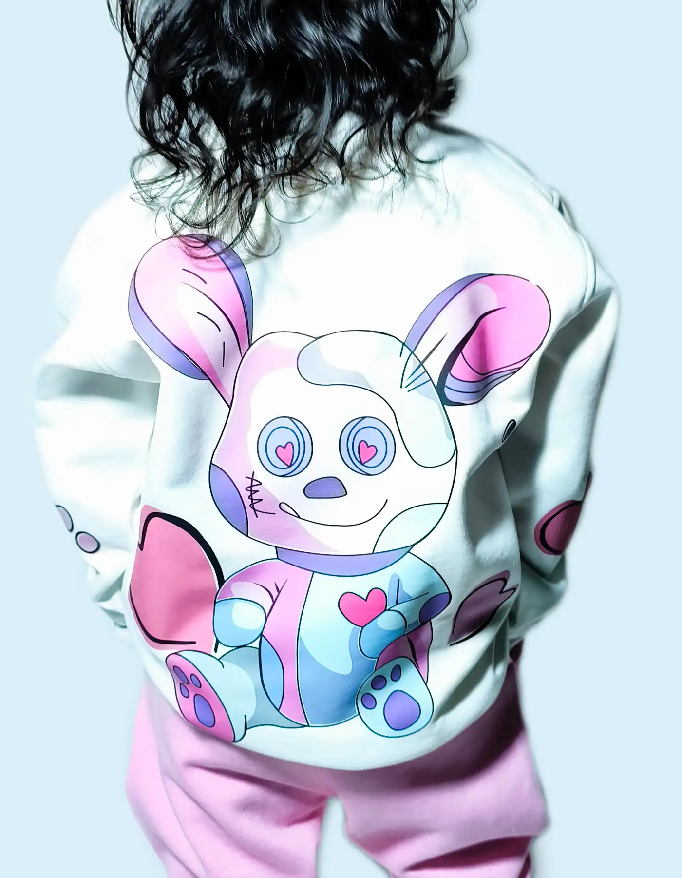 - Sudadera blanca con un osito en tonos pastel y corazones, un diseño que destaca por su ternura.